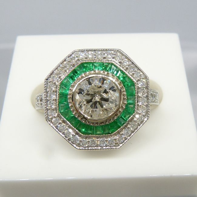 An Art Deco-inspired 14ct white gold 1.33ct diamond and 0.40ct emerald target ring with certificate