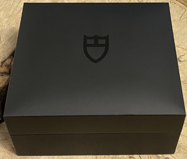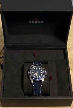 Blue suede strap with white stitching Stainless steel Tudor clasp, stainless steel case screw down crown with Tudor rose emblem Rotatable bezel with ceramic insert Luminous hands and baton markers Blue dial Sapphire crystal Inner and outer boxes and cardboard sleeve Original purchase receipt Screw back case Calibre MT5402 70 hours power reserve Serial number Q205*** Case back Luminous bezel pip Fully stickered Three-fold clasp 39mm Case size11.9mm Thick case, 20mm lug width *THIS WATCH WAS A UNWANTED GIFT AND HAS NEVER BEEN WORN AT ALL BEFORE BEING PART EXCHANGED WITH OURSELVES FOR A ROLEX SUBMARINER*
