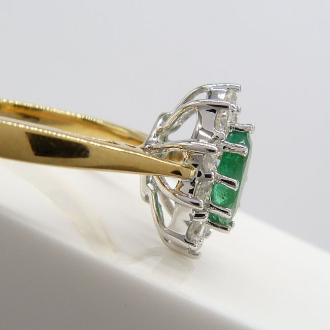 A 0.80ct oval-cut emerald and 0.50ct round brilliant-cut diamond cluster ring in 18ct yellow gold