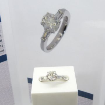 Central diamond: natural; round brilliant-cut; 1.57 carats; H colour; I1 clarity; good cut grade
