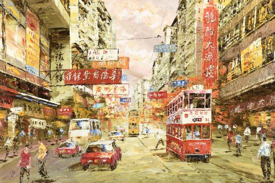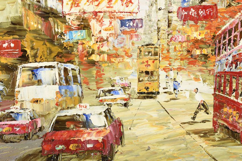 7307 - Original impressionist oil on canvas board depicting a busy Hong Kong street scene.