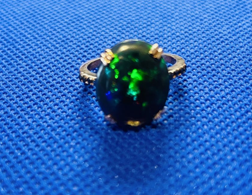 Beautiful Natural Black Fire Opal Ring With Diamonds And 18k Gold.