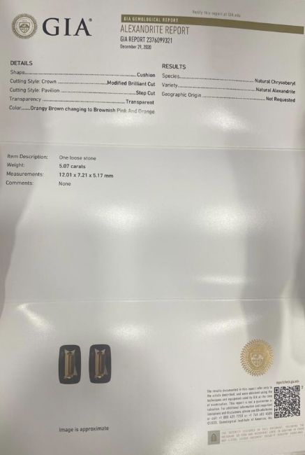 5.07 CT. Natural alexandrite chrysoberyl GIA full report certified Colour: yellow green changing to Brown yellow Weight: 5.07 CTS Cutting style: Brilliant modified cut Shape: cushion Measurement: 12.01x7.21x5.17mm Clarity: VVS, transparent Comments: None Certificate: GIA Report number: 2376099321 Origin: Sri Lanka seller opinions