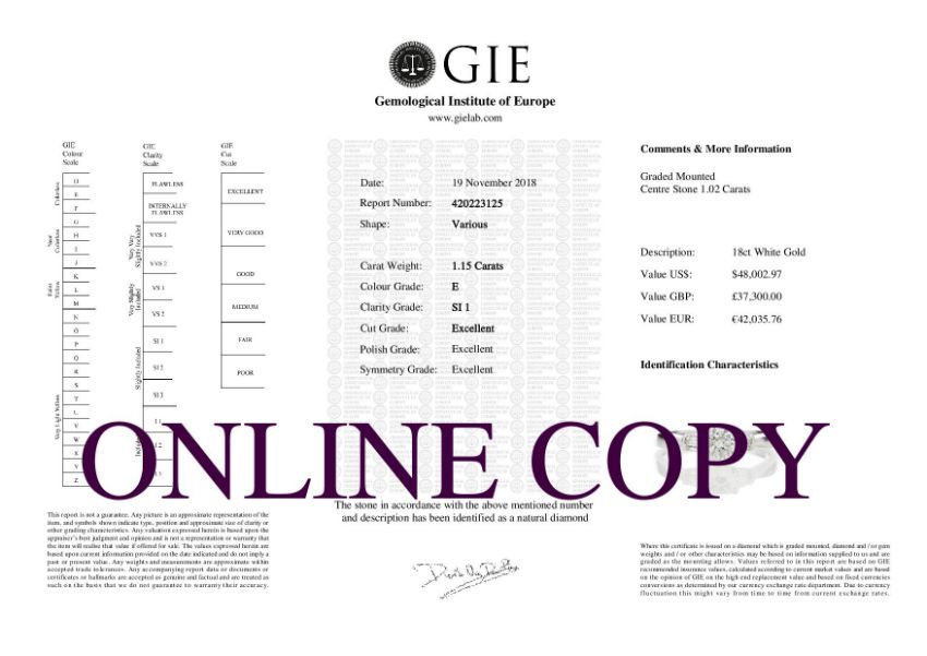 A beautiful round brilliant cut diamond lies between six baguettes set in an 18 carat white gold ring. This simple yet stunning piece is a perfect engagement ring and sure to be appreciated by the loved one. The ring is supplied with the orginal certificate report and a gift box.Item Specification. .Carat:1.15.Colour:E. Clarity:SI 1. Cut:ExcellentMetal: 18ct White Gold.Ring Size: M (This ring can be re-sized by the vendor prior to shipping if necessary).. Condition: Boxed - Unworn - from Manufacturer. Certificate: GIE. Certificate Number: 420223125. Certificate Link: https://reportcheck.gielab.com/viewpdfreport.php?id=420223125. SC:3113069""
