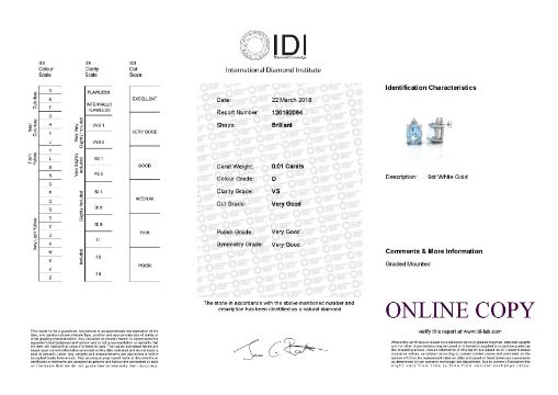 A beautiful oval shaped blue topaz sits below a round brilliant cut diamond one each of these gorgeous 9ct white gold earrings. Add a touch of sparkle with these dazzling earrings. The lot is supplied with the original certificate report and a gift box.Item Specification. .Carat:0.01.Colour:D. Clarity:VS. Cut:Very GoodMetal: 9ct White Gold.. Condition: Boxed - Unworn - from Manufacturer. Certificate: IDI. Certificate Number: 120192064. Certificate Link: https://www.idi-lab.com/reportcheck/viewpdfreport.php?id=120192064. SC:8280020L""
