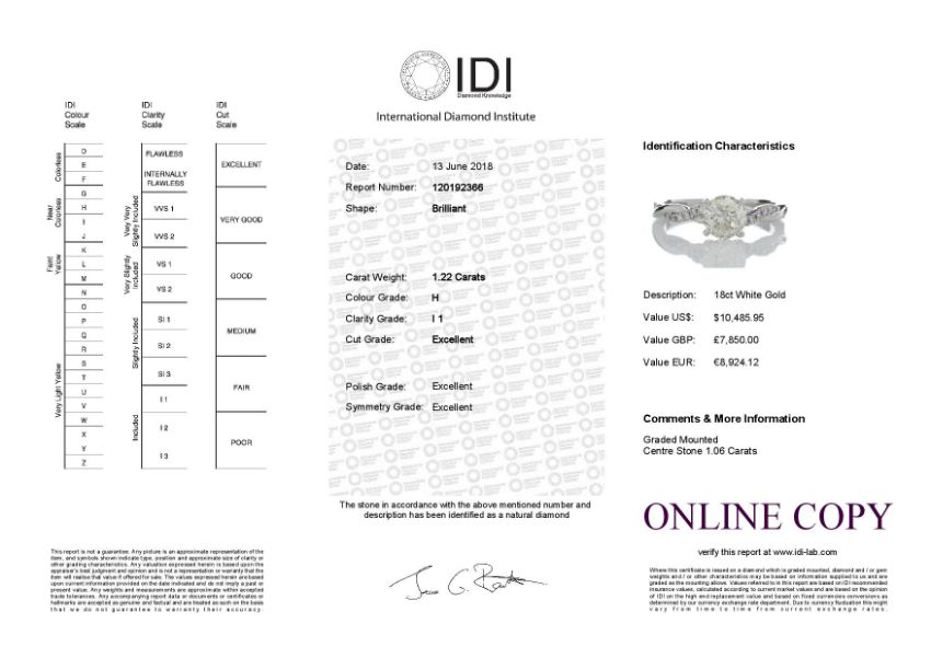 A dazzling round brilliant cut diamond 1.06 carats sits between twenty four round brilliant cut diamonds in this twist top shank engagement ring to give a total diamond weight of 1.22 carats. This enchanting ring is a fabulous accessory for every occasion and also makes the perfect gift.Item Specification. .Carat:1.22.Colour:H. Clarity:I 1. Cut:ExcellentMetal: 18ct White Gold.Ring Size: M (This ring can be re-sized by the vendor prior to shipping if necessary).. Condition: Boxed - Unworn - from Manufacturer. Certificate: IDI. Certificate Number: 120192366. Certificate Link: https://www.idi-lab.com/reportcheck/viewpdfreport.php?id=120192366. SC:3115003""