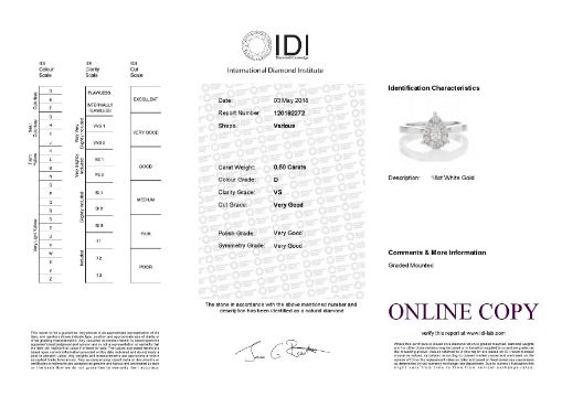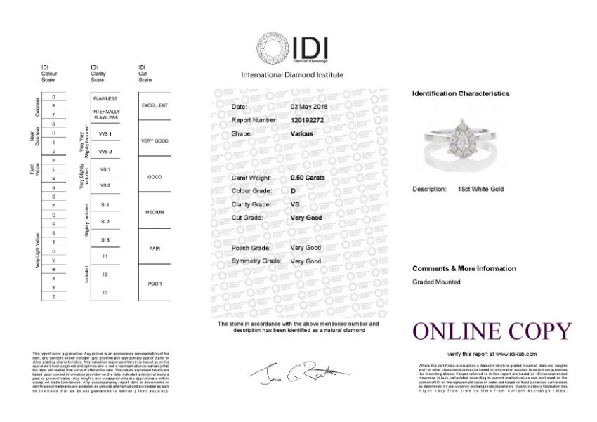 A modern classic style diamond engagement ring with a lively natural pear shaped diamond in the centre surrounded by nine round brilliant cut diamonds on the halo with a total diamond weight of 0.50 carats set in an 18ct white gold ring . This beautiful and timeless piece has a lovely sparkle.Item Specification. .Carat:0.5.Colour:D. Clarity:VS. Cut:Very GoodMetal: 18ct White Gold.Ring Size: M (This ring can be re-sized by the vendor prior to shipping if necessary).. Condition: Boxed - Unworn - from Manufacturer. Certificate: IDI. Certificate Number: 120192272. Certificate Link: https://www.idi-lab.com/reportcheck/viewpdfreport.php?id=120192272. SC:3176001""