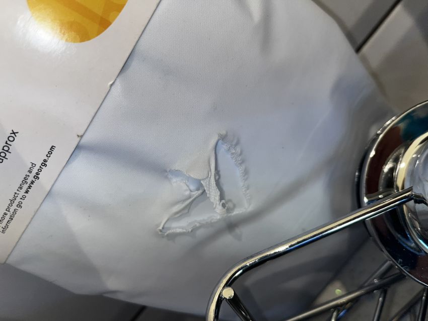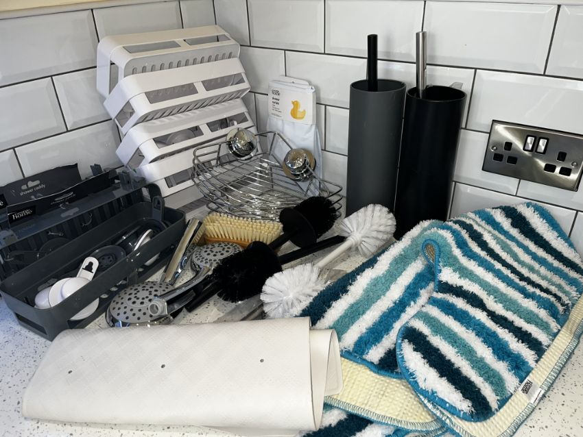 All items appear new - However, Shower curtain has a tear as shown.