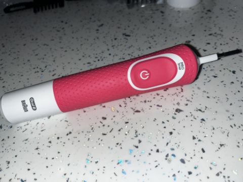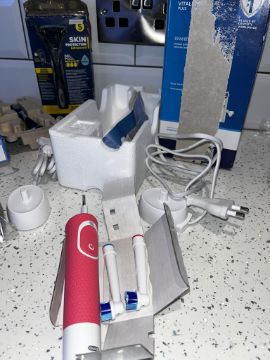 Braun Oral-B Pink toothbrush and two chargers & Brush heads - appears completely new, however, box is damaged - Tested charged and working