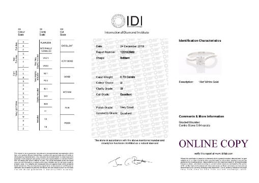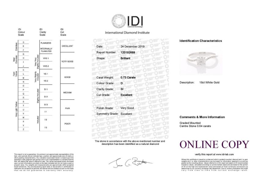One stunning natural round brilliant cut diamond 0.64 carats set in an 18ct white gold engagement ring with an 18ct white gold four claw crossover grain setting. Set with fourteen brilliant cut diamonds on the shoulders to make a total diamond weight of 0.73 carats.Item Specification. .Carat:0.73.Colour:D. Clarity:SI. Cut:ExcellentMetal: 18ct White Gold.Ring Size: M (This ring can be re-sized by the vendor prior to shipping if necessary).. Condition: Boxed - Unworn - from Manufacturer. Certificate: IDI. Certificate Number: 120192689. Certificate Link: https://www.idi-lab.com/reportcheck/viewpdfreport.php?id=120192689. SC:3113242"