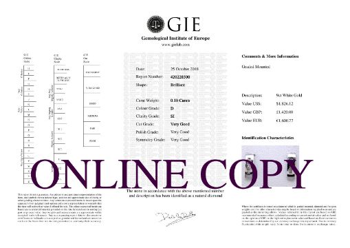 Item Specification. .Carat:0.1.Colour:D. Clarity:SI. Cut:Very GoodMetal: 9ct White Gold.. Condition: Boxed - Unworn - from Manufacturer. Certificate: GIE. Certificate Number: 420228500. Certificate Link: https://reportcheck.gielab.com/viewpdfreport.php?id=420228500. SC:8236001"