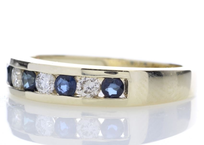 Four stunning sapphires 0.30 carats set between three sparkling round brilliant cut diamonds 0.25 carats in an 9ct yellow gold half eternity ring. Add a splash of colour with this beautiful ring. It is a nice touch for every day and suitable for any season.Item Specification. .Carat:0.25.Colour:D. Clarity:VS. Cut:Very GoodMetal: 9ct Yellow Gold.Ring Size: M (This ring can be re-sized by the vendor prior to shipping if necessary).. Condition: Boxed - Unworn - from Manufacturer. Certificate: GIE. Certificate Number: 420221878. Certificate Link: https://reportcheck.gielab.com/viewpdfreport.php?id=420221878. SC:7154009P"