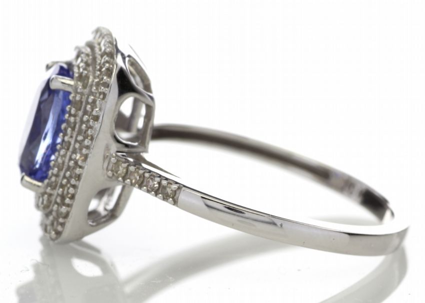 A stunning oval cut Tanzanite 1.29 carats sits surrounded by a double halo set with fifty two single cut diamonds and eight single cut diamonds on the shoulders in this gorgeous 14ct white gold ring. This is a classic ring which will add an elegant touch to any outfit.Item Specification. .Carat:0.33.Colour:D. Clarity:SI1. Cut:Very GoodMetal: 14ct Gold.Ring Size: M (This ring can be re-sized by the vendor prior to shipping if necessary).. Condition: Boxed - Unworn - from Manufacturer. Certificate: GIE. Certificate Number: 420221972. Certificate Link: https://reportcheck.gielab.com/viewpdfreport.php?id=420221972. SC:6173001TZ"