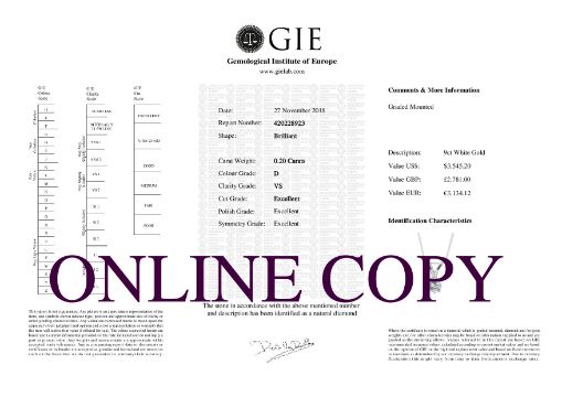 Item Specification. .Carat:0.2.Colour:D. Clarity:VS. Cut:ExcellentMetal: 9ct White Gold.. Condition: Boxed - Unworn - from Manufacturer. Certificate: GIE. Certificate Number: 420228923. Certificate Link: https://reportcheck.gielab.com/viewpdfreport.php?id=420228923. SC:8303002"
