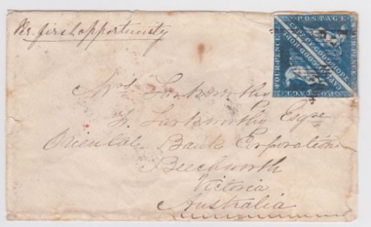 Cover (part flap missing, faults to right edge) to Beechworth, Victoria, bearing 4d triangular pair tied triangular "CGH", sent by private ship via Mauritius with backstamps of Kalk Bay, Cape Town, Mauritius, Melbourne and Beechworth.   A scarce destination for a Cape Triangular cover.