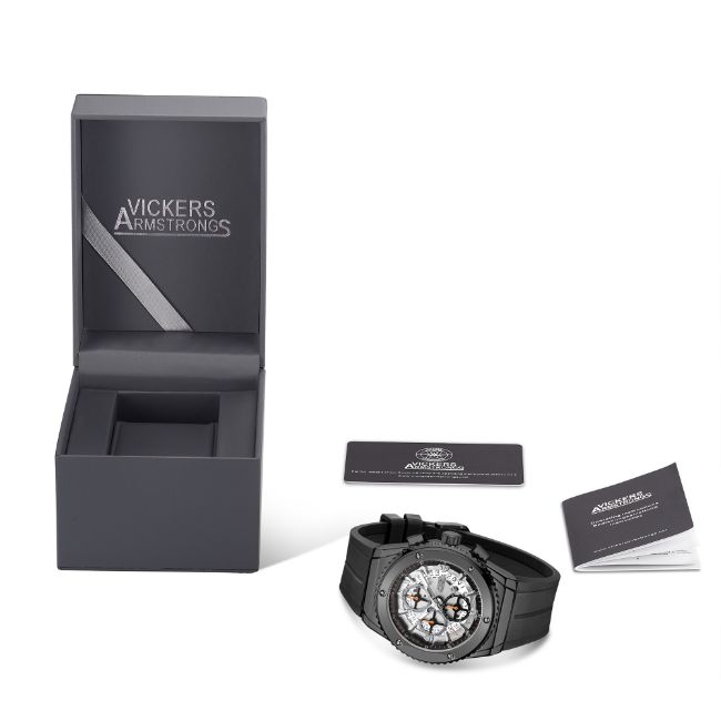 The Vickers Armstrongs logo engraved stainless steel caseback and black silicone strap add the final details to the timepiece that achieves the optimal balance between the functionality demanded of a quality navitimer, and the graceful engineering that represents the foundations of Vickers Armstrongs.