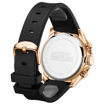 The Seiko Quartz Chronograph movement boasts supreme precision that is vital for assuring passenger safety, while the Seconds, Minutes, Date and 1/10 second counter all reflect instruments that would be familiar to any pilot and stand out with vibrant orange details. Its tachymeter chapter ring allows you to measure speed based on time and distance, and this surrounds a deep sky blue dial that contrasts with rose gold markers. The Vickers Armstrongs logo engraved stainless steel caseback denotes dependability, while the black silicone strap is intriguingly detailed with a blue stripe, paying homage to the company's military roots while still highlighting the shifting needs for air travel.