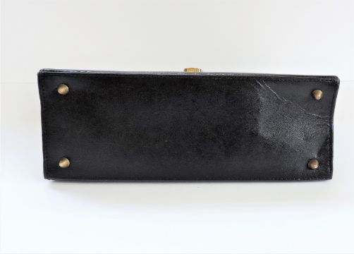 The front of the bag is lizard and the back is plain black leather and the interior is black leather with one zip and one patch pocket.