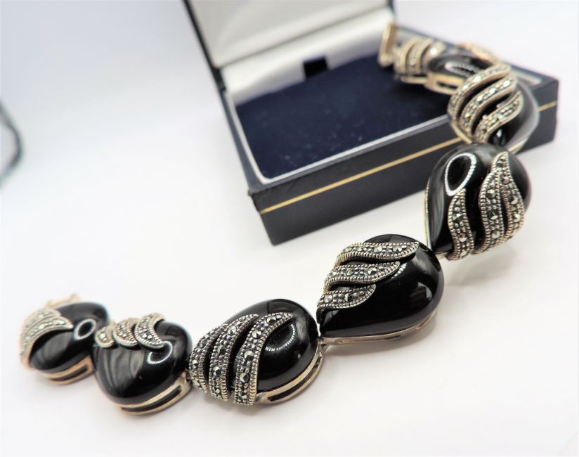 The stones are placed within exquisite sterling silver leaf settings that have been embellished by dazzling Marcasite stones bringing a sophisticated sparkle to the bracelet.