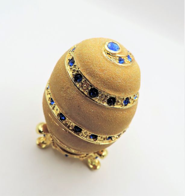 A Faberge style hinged egg trinket box in textured gold finish and set with blue stones on a gilt stand inset with blue stones.
