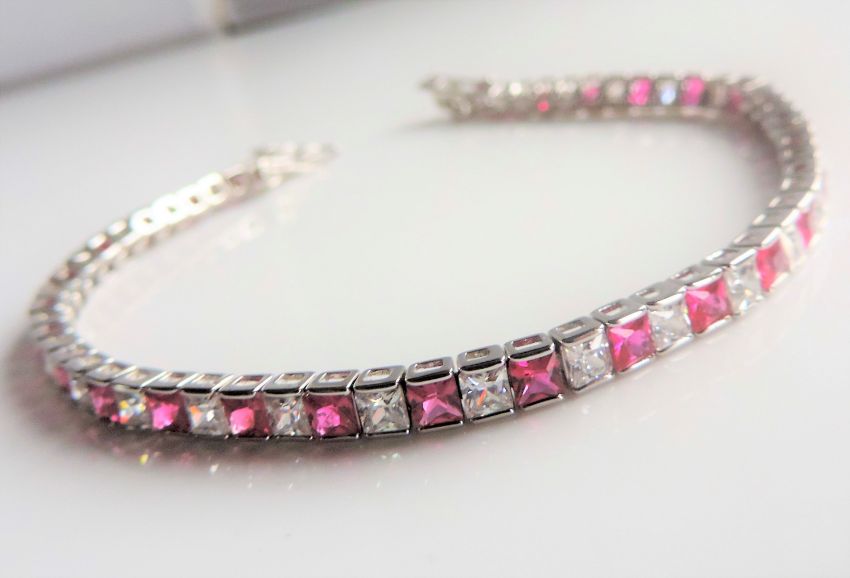 A beautiful sterling silver tennis bracelet set with 58 x 3mm (TCW 8) sparkling square cut pink and white Topaz gemstones.