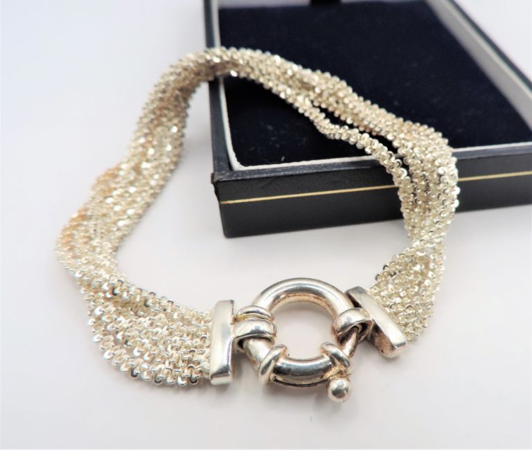 A gorgeous 5 strand sterling silver bracelet 7 inches (18cm) secured with a 14mm spring buoy clasp.