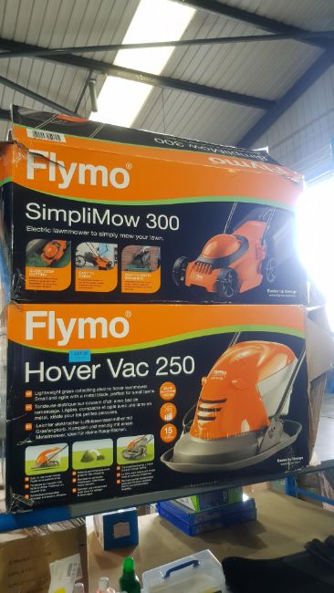 Title: (1E) Lot RRP £195. 2x Flymo Items. 1x Hover Vac 250 RRP £110. 1x Flymo SimpliMow 300 RRP £85.