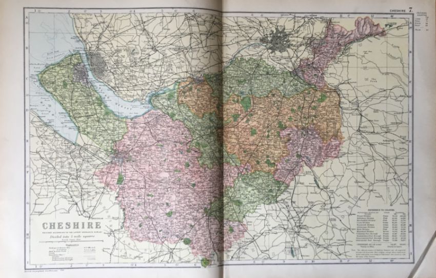 Title: Coloured Antique Large Map Cheshire Liverpool North Wales 1904 Etc.