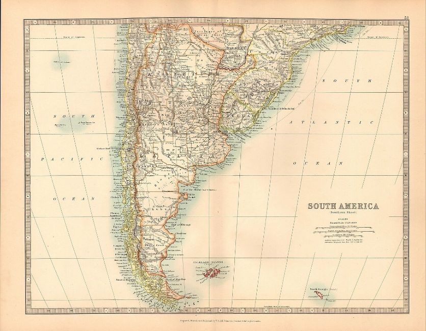 South America South  Paraguay Uruguay Falklands Island Etc Large Antique Map.