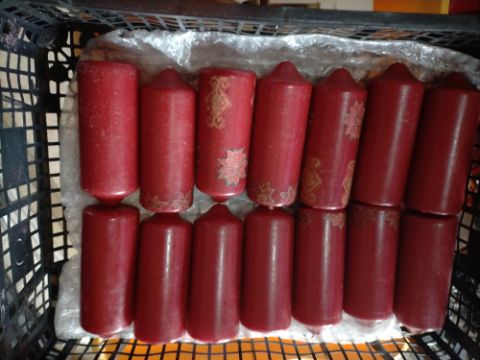 Title: 28 x Burgundy Pillar Candles (Some With Floral Design)
