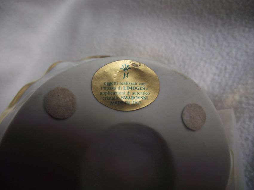 It is incised "Made in Italy, RG" with the Crown logo - with a foil sticker "Collezione R.G. oggetti realizzati con impasti di LIMOGES e applicazioni di autentico cristallo SWAROVSKI, Made in Italy".