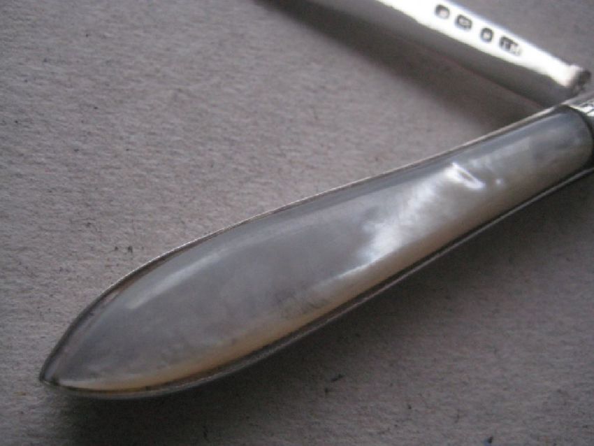 The mother of pearl handle is encased with a silver border all the way round the knife.