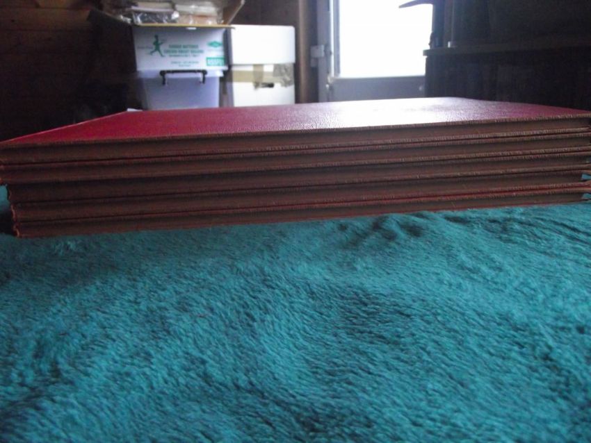 Condition: Minor wear and some fading to red leather boards - spines intact with gilt title and raised bands - text blocks all firm with dyed red edges to pages - foxing to all endpapers - some foxing spots to pages but mostly clean with minor handling marks - a lot of early tape repairs to closed tears (mainly in the margins) - the worst are shown - see all images for condition.