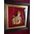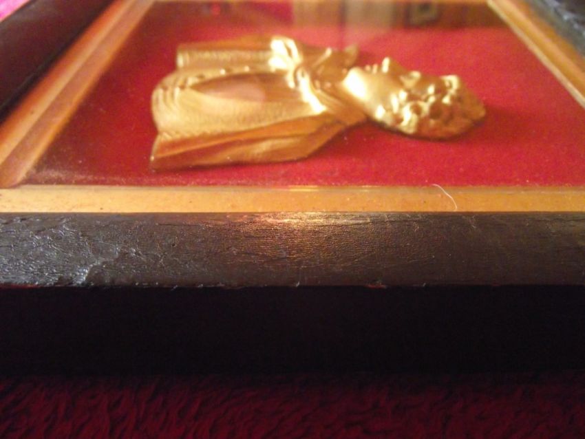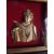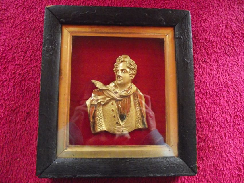 The plaque mounted on a red felt board, within a black stained wooden and glazed rectangular frame, the image inspired by Sanders 1807 portrait at the Byron's exhibition at Victoria & Albert Museum.