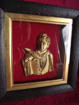 A bas-relief gilt bronze plaque portraying Lord Byron as a young sailor, wearing a long cravat, a soft collar shirt decorated with vertical bands and a pattern of interwoven diagonal lines, a single-breasted waistcoat decorated with abstract motifs and twirls all over the neck, the same floral twirls decorating the interior of the overcoat.