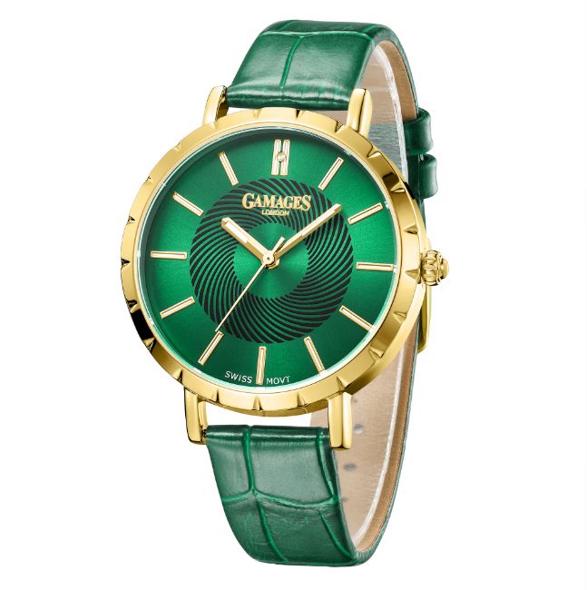 The Swiss Quartz movement delivers dependable operation and powers the luminous hands across a green dial with a swirling centre pattern that demands attention, much like Garson’s eyes. This dial is detailed further with elegant analogue markers, with the 12 position set with a single celebratory diamond.