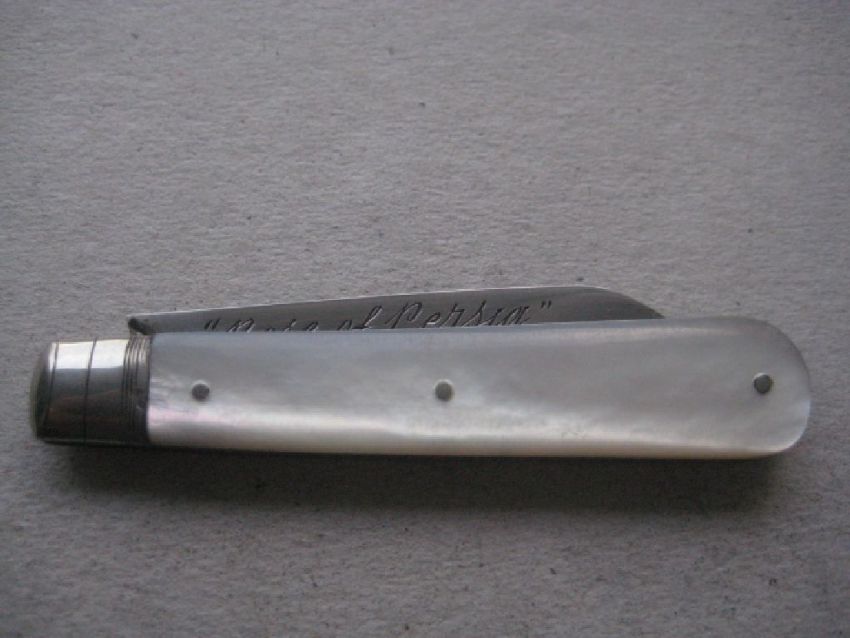 The mother of pearl handle is plain. The Silver blade is engraved "Rose of Persia 1926" on it.