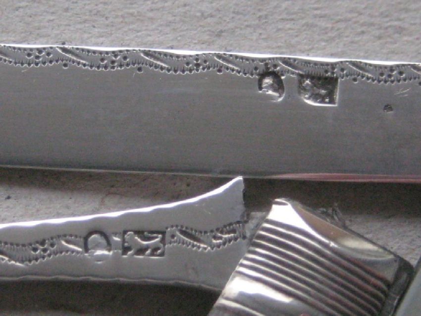 There is bright-cut engraving to the knife blade as well as the fork blade. The knife and fork come with their leather hinged case as well.