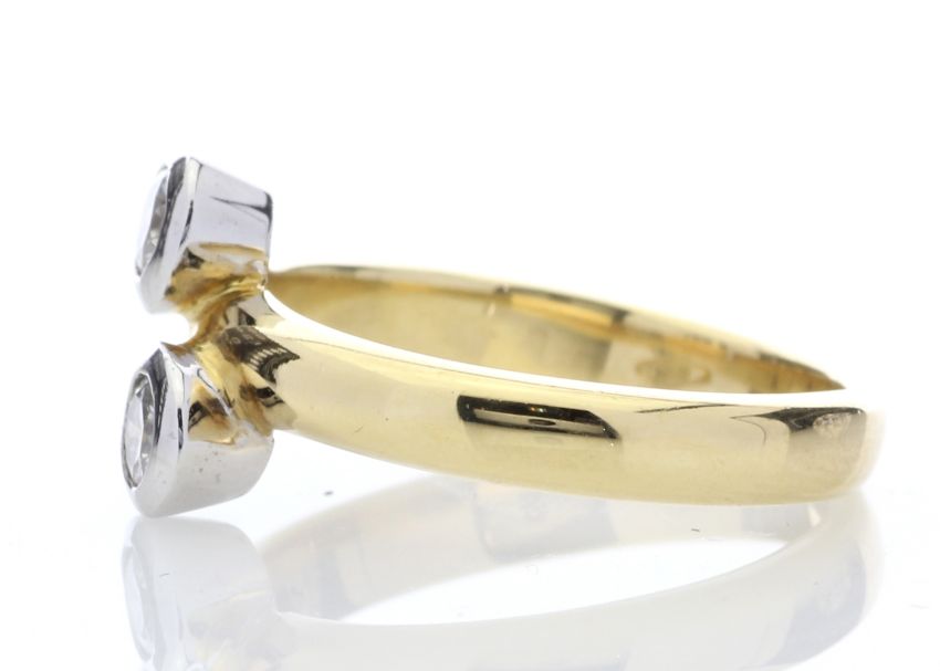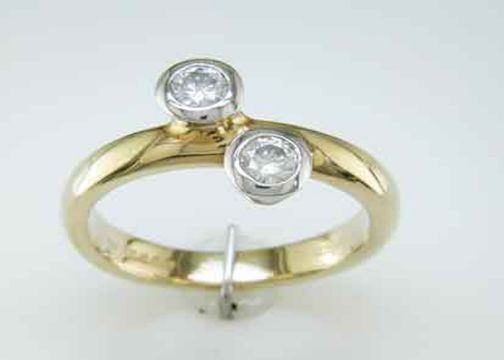 Two natural round brilliant cut diamonds 0.36 carats are set in a dazzling 18ct yellow gold ring with a white gold rub-over setting.