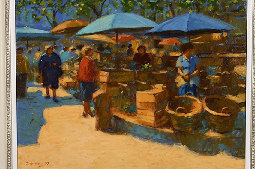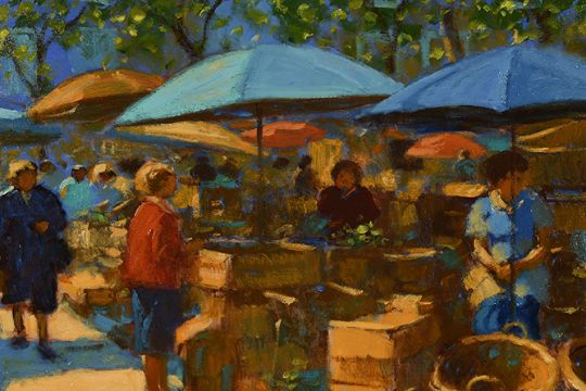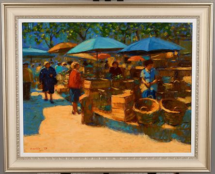 The title is "Carcassonne Market" painted in 1999 this is a superb example of Mackie's earlier work.