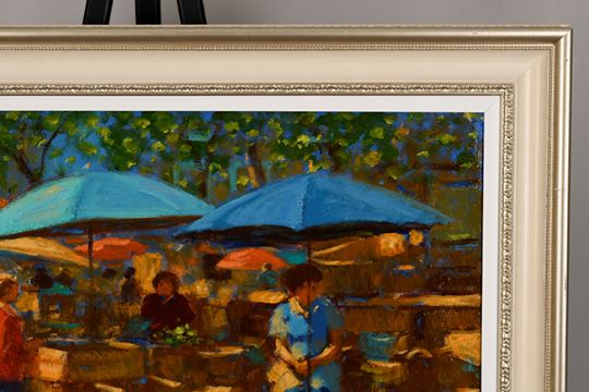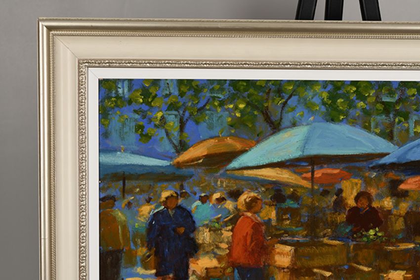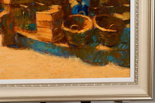 This is a very colourful market scene and beautifully framed to compliment the piece.