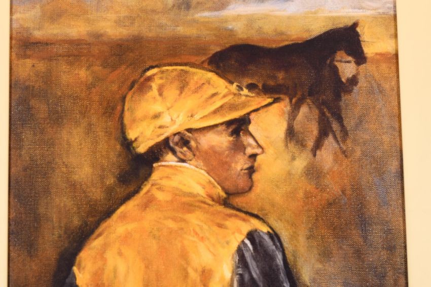 This image depicts a romanticised version of a jockey's preparation before the race.