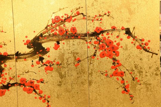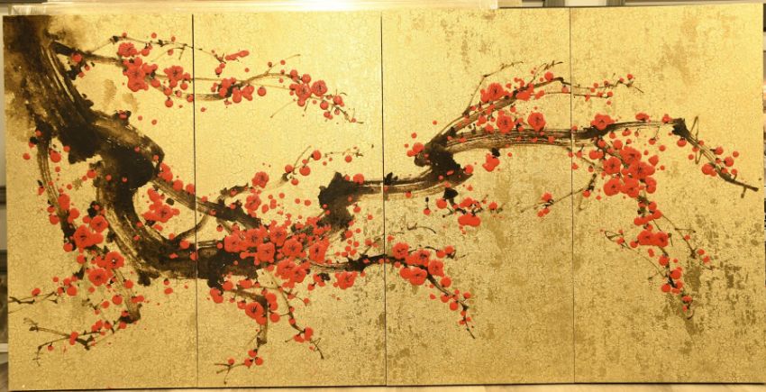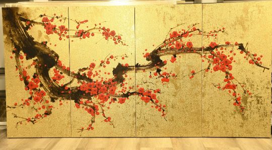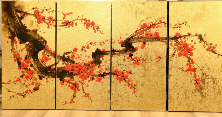 7747 - This striking art painting has gold leaf inlaid on each panel.
