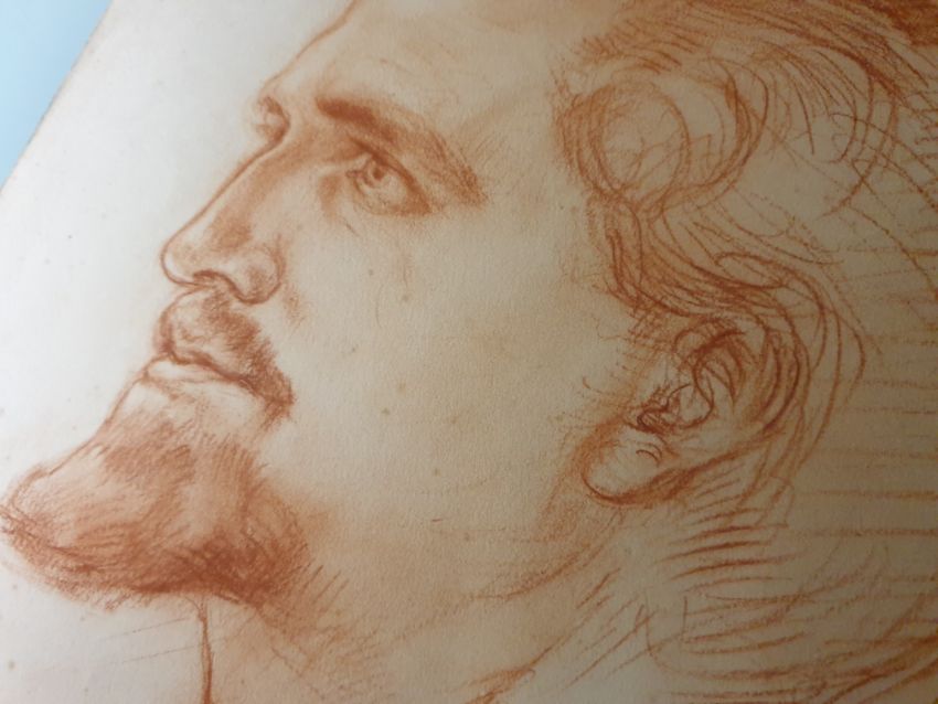 Red chalk portrait drawing, artist signed, size ca 38 x 28 cm.