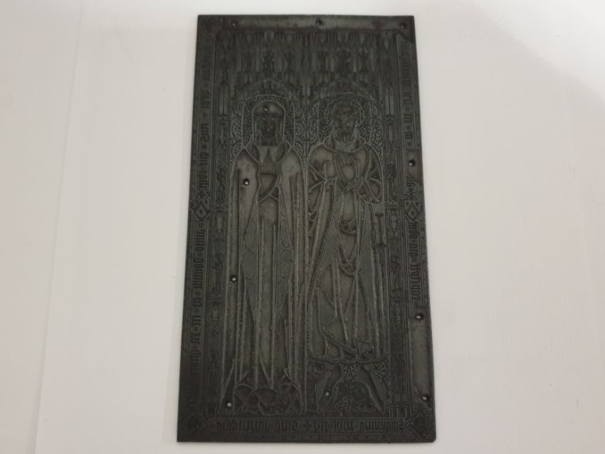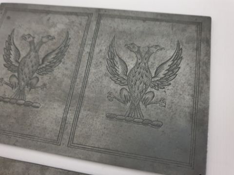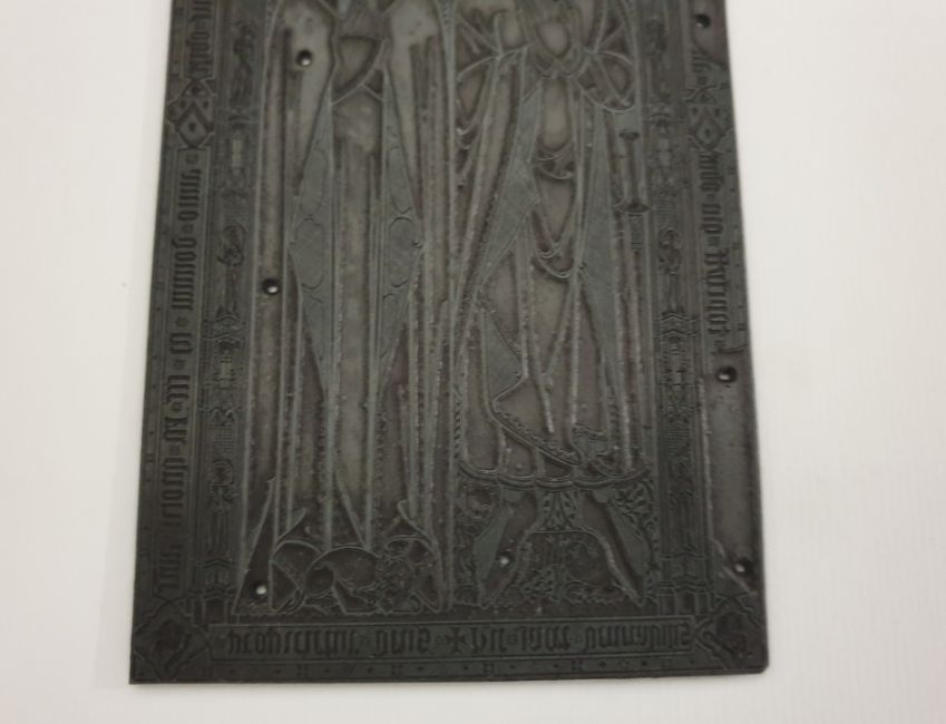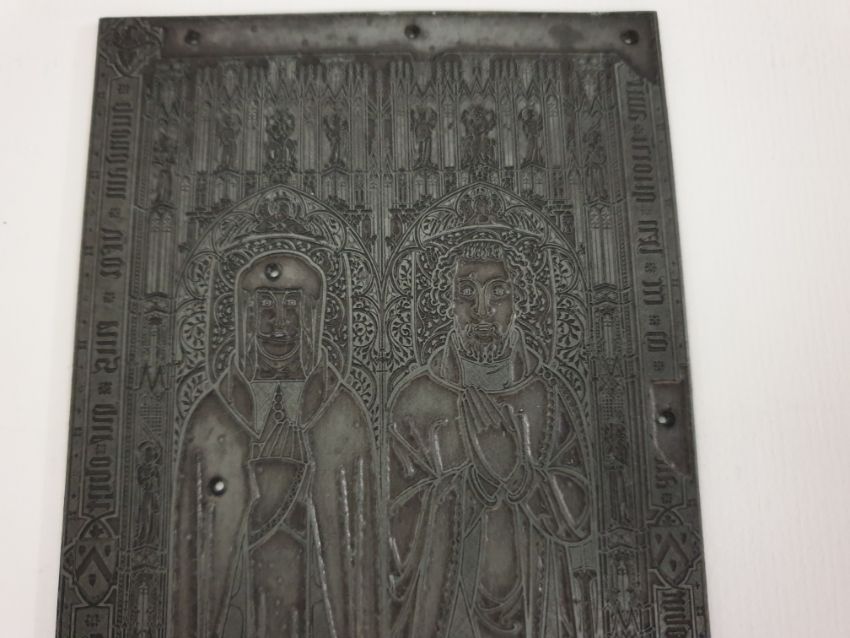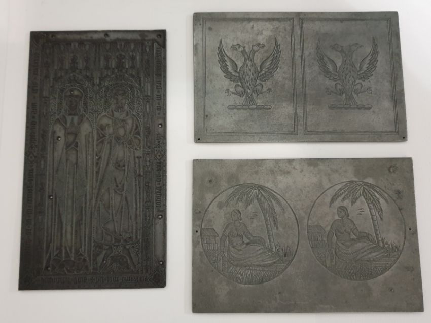 Three antique zink printing matrix blocks, church knight (18 x 9.5 cm) - trade mark (15 x 10cm) - coats of arms (15 x 9.5 cm).
