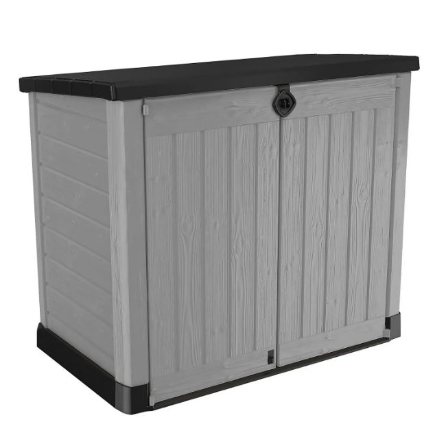 This storage bin is easy to assemble and is ideal for storing items ranging from barbecues to lawn furniture.