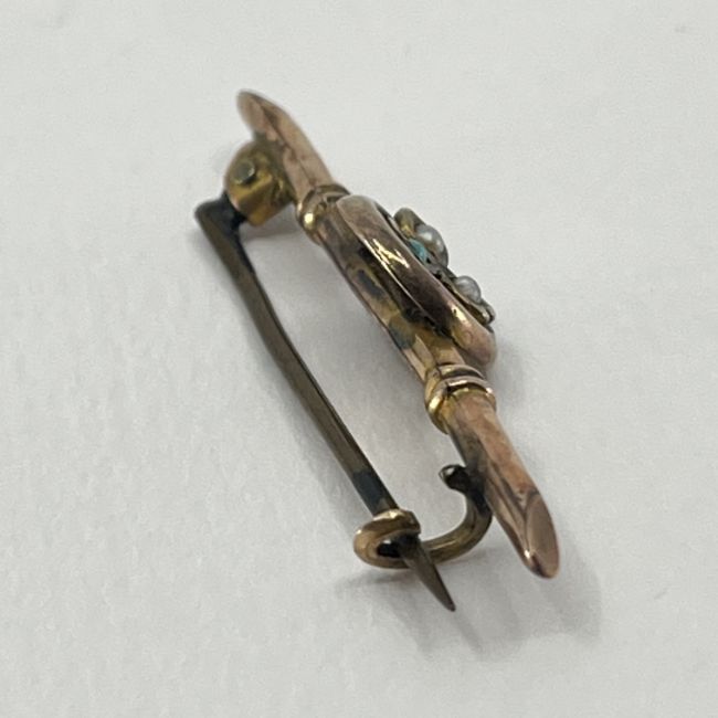 An antique bar brooch, central shamrock set with seed pearls and turquoise.