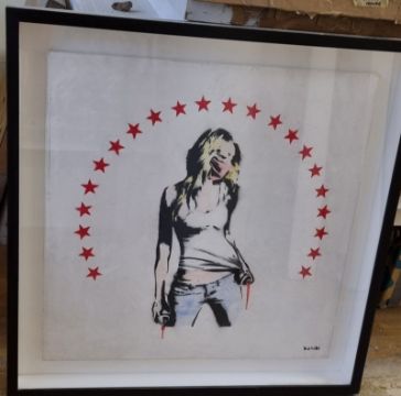 Bambi's stencilled work is described as gritty and masculine in appearance while exploring themes of feminism, and popular and street culture. Bambi is the pseudonym of a contemporary British street artist whos shares another similarity to BANKSY, they remain anonymous to the public and press.