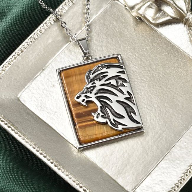 The square Yellow Tigers Eye embedded on the pendant is detailed with a carved lion face.
