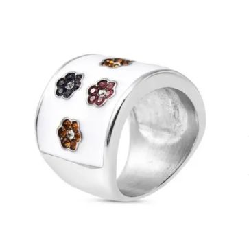 A floral design ring that comes to life when the floral design is supported by the white enamelled backdrop of this ring.